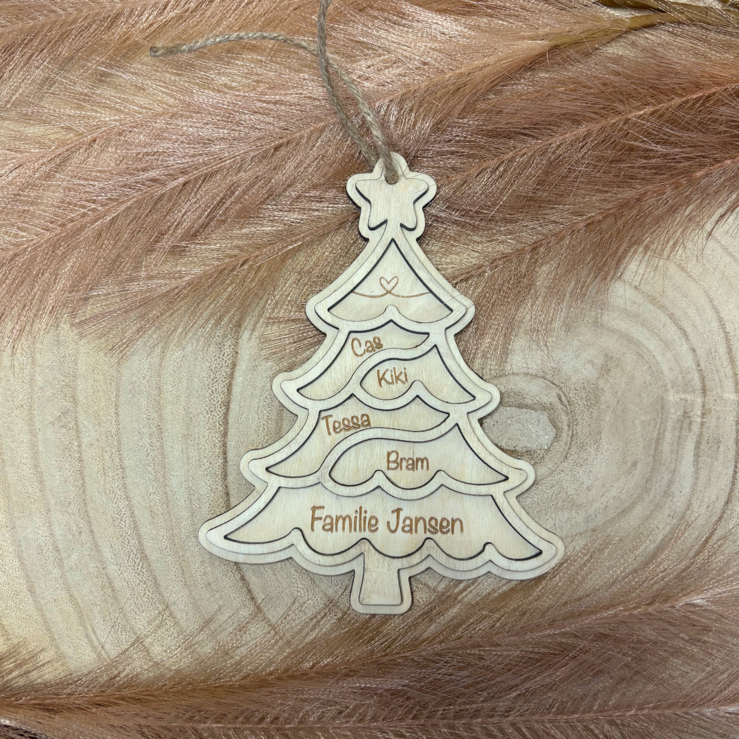 Prachtige houten kersthanger in kerstboomvorm, gemaakt uit 2 lagen berkenhout.