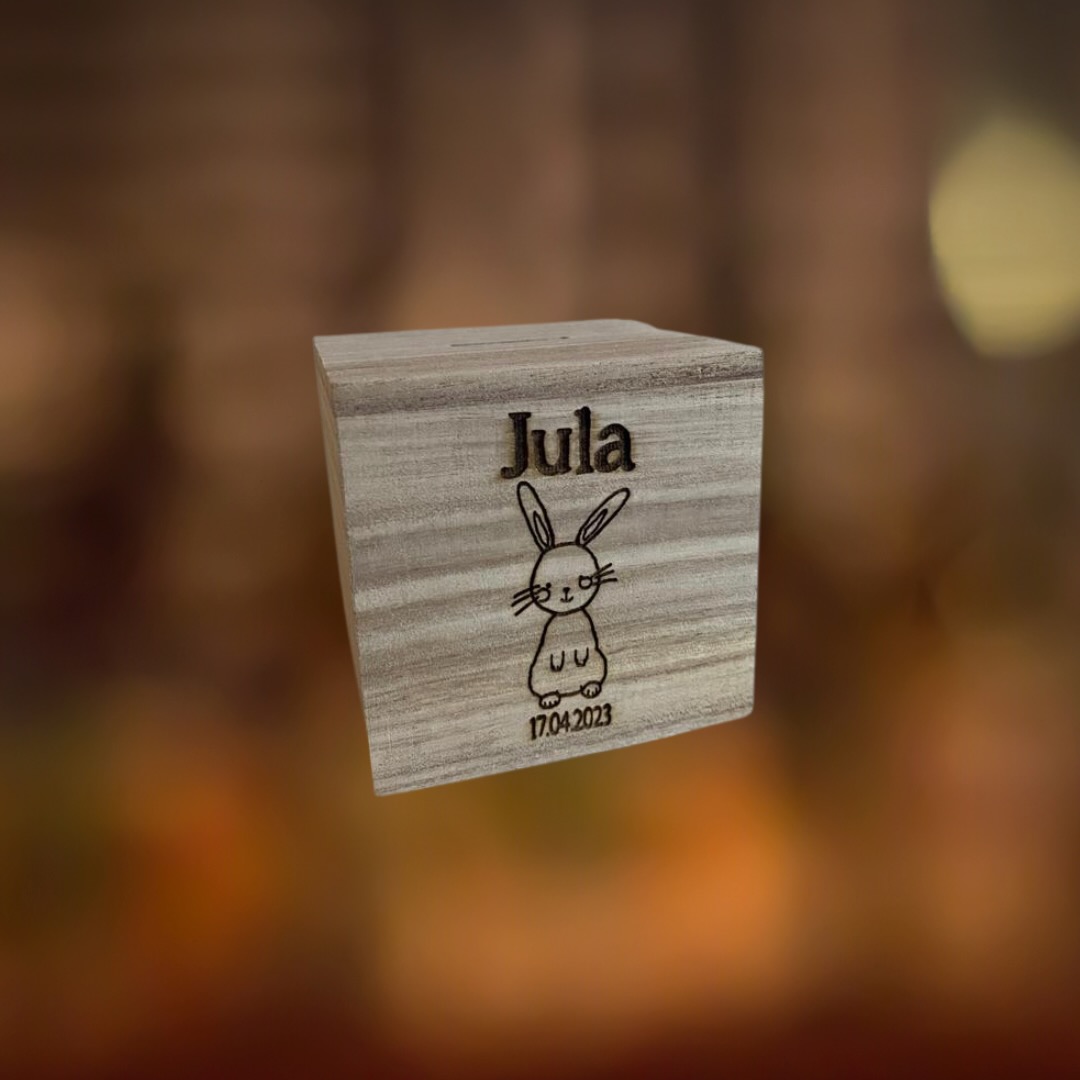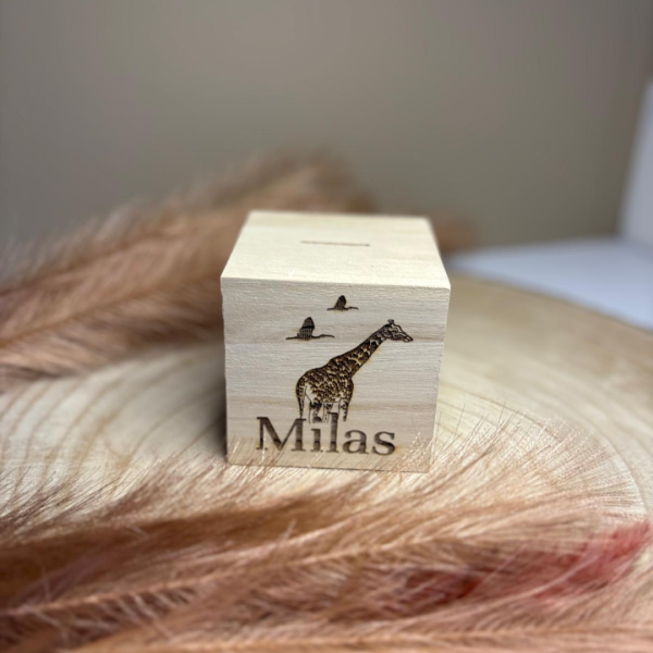 Spaarpot met klein plaatje van het geboortekaartje met naam erbij gegraveerd.